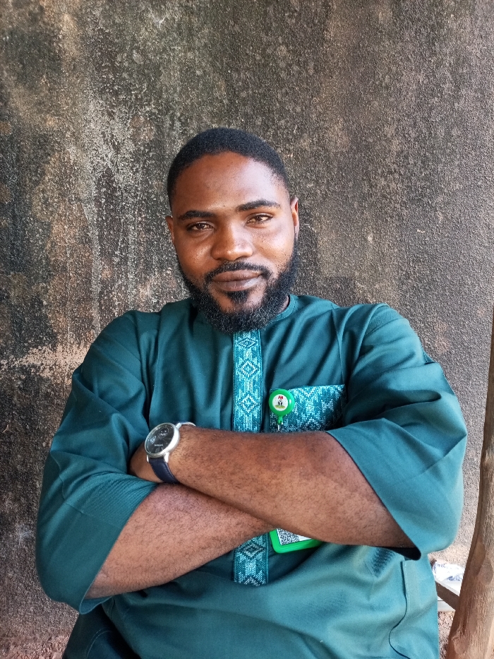 An adult male stands centrally against a textured, weathered concrete wall in Kakuri Gwari, Nigeria