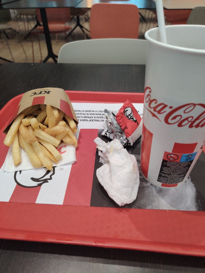 - "A red plastic fast-food tray is centrally positioned on a dark table surface within a KFC restaurant located in Burgas, Bulgaria" by FM-cZ49r1, licensed under CC BY 4.0