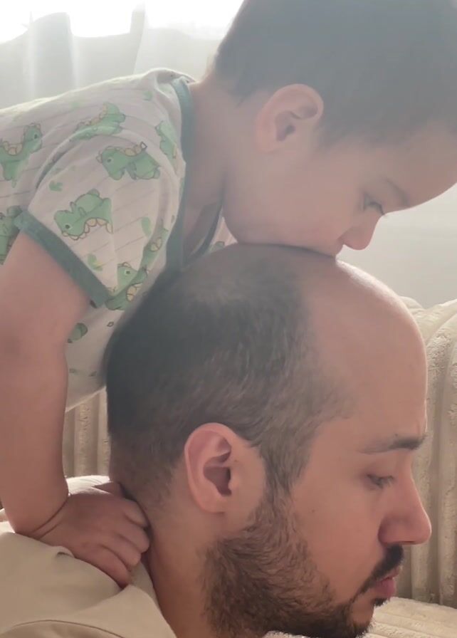 A young child in a white pajama top with green dinosaurs is bent over a man and has their head on top of his head. The man has dark hair and a beard. The child's hands are resting on the man's neck. They are both inside in a room with a tan couch. The light is bright.