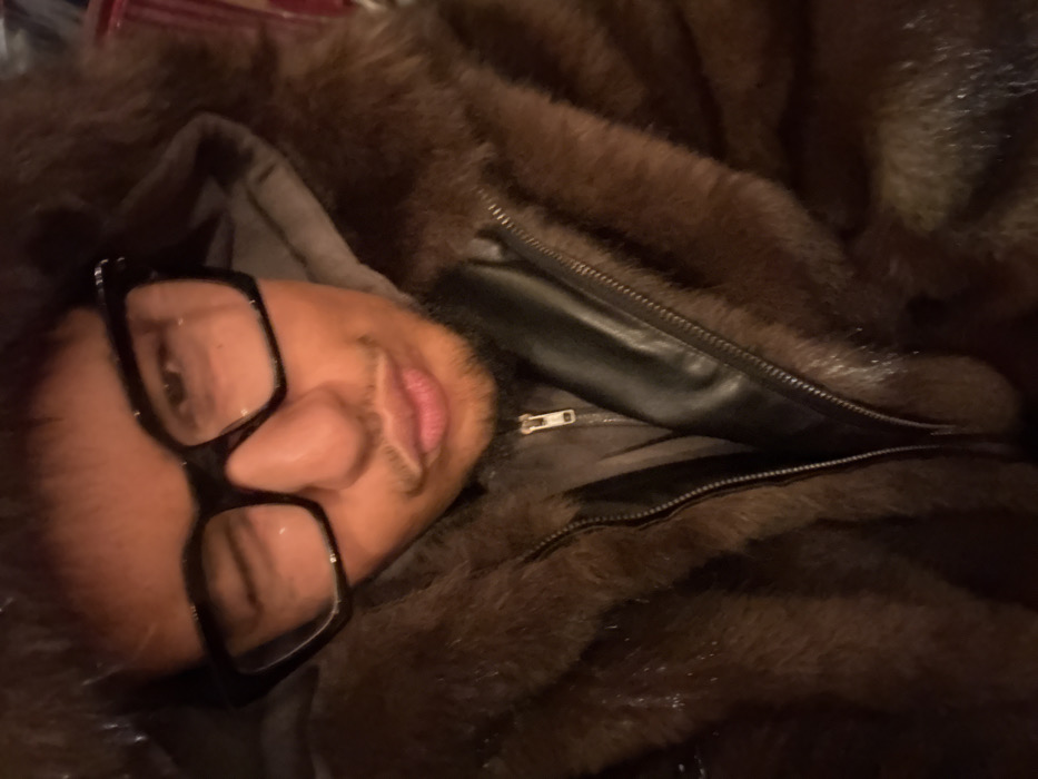 - "A close-up, front-facing image features an individual wearing a dark brown fur or faux-fur hooded coat" by FM-5A5Aq1, licensed under CC BY 4.0
