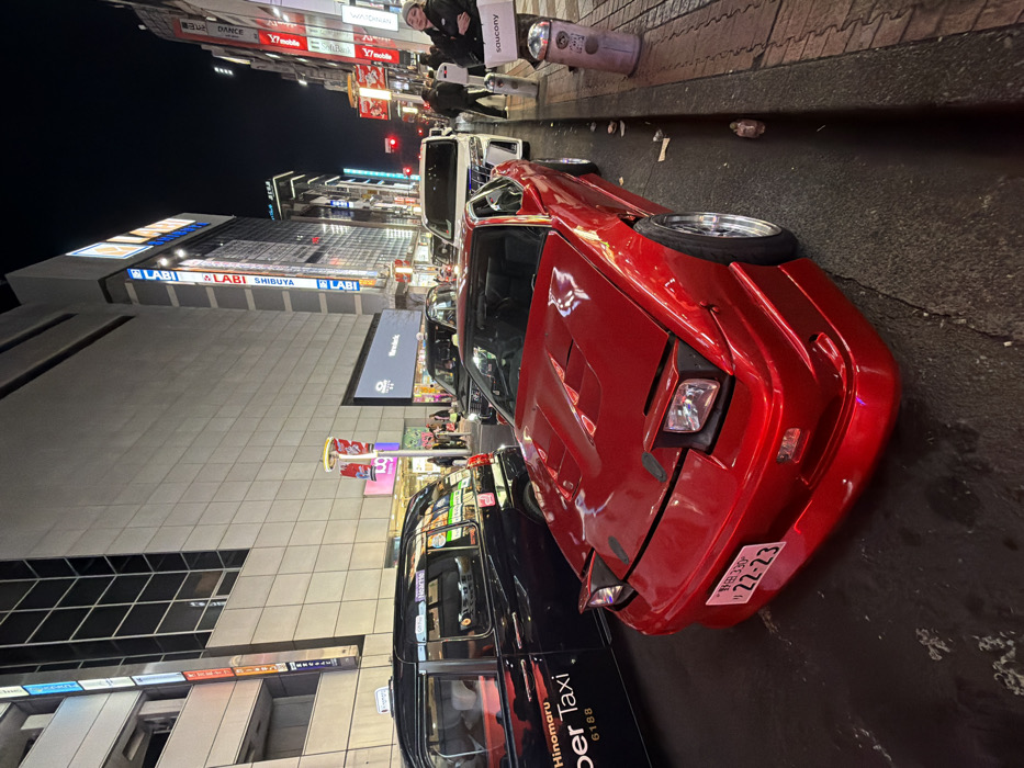This image captures a nighttime street scene in Shibuya, Japan, identified by the prominent "LABI SHIBUYA" sign on a tall building to the right. In the foreground, a modified, bright red Nissan 180SX sports car is positioned on the street, angled slightly towards the left. Its pop-up headlights are deployed, and it features a custom hood with vents and aftermarket wheels with polished rims and stretched tires. A Japanese license plate, "世田谷 330 ち 22-23", is affixed to its front bumper. To the left of the red car, a black Hinomaru Kotsu "Uber Taxi" minivan, marked with "Hinomaru Uber Taxi 6188", is partially visible. Further down the street, behind the red car, a white Toyota Alphard or Vellfire minivan is clearly visible, along with other vehicles indicative of urban traffic. On the right sidewalk, a woman wearing a light-colored beanie and a dark jacket stands near a gray cylindrical bollard, looking slightly towards the camera. She appears to be holding a bag with the brand "saucony" visible. Several other pedestrians are present in the background, walking or standing on the sidewalks. The street surface appears somewhat wet or reflective under the artificial light. Litter, including a plastic bottle, is visible in the narrow gutter between the red car and the sidewalk. Tall, multi-story commercial buildings line both sides of the street, featuring numerous illuminated vertical and horizontal signs with Japanese text, typical of a bustling commercial district at night. A red traffic light is visible in the distance.