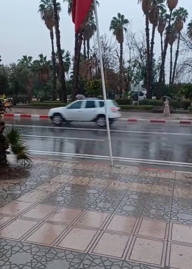 street scene on a rainy day. Cars are driving on a wet road alongside a park with palm trees. A large red flag is visible in the foreground. The ground is tiled with a patterned design. People with umbrellas can be seen walking in the park. The overall scene depicts a typical rainy day in an urban environment.