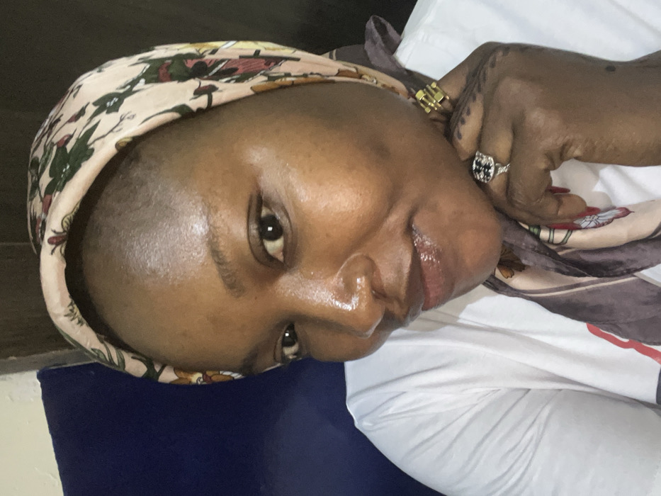 A woman with dark skin wears a patterned headscarf. Her eyes are dark and glossy, with a slight sheen on her forehead and nose. She has rings on her fingers, including one that resembles a wristwatch. Her hand rests near her face, and she wears a white shirt with a design on the shoulder. The background appears to be a dark blue or black surface.
