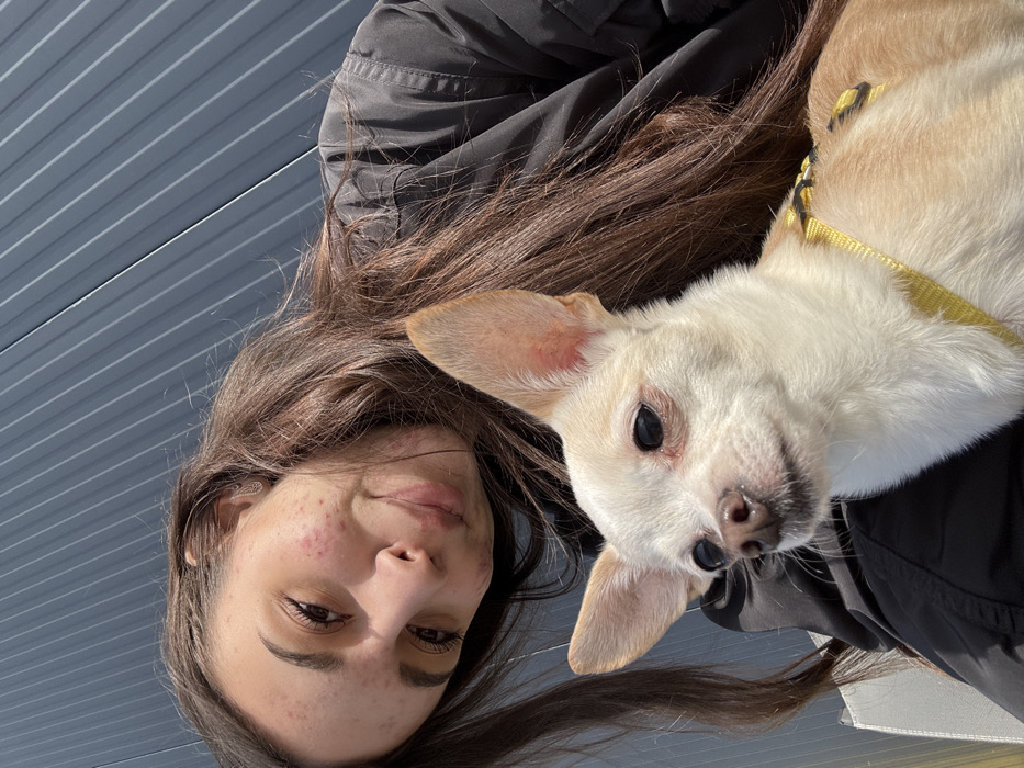 A close-up image depicts a young adult female and a small dog outdoors in Kozloduy, Bulgaria. The female subject, positioned on the left side of the frame, has long, dark brown hair and a visible skin condition on her face, primarily on her cheeks and chin. She wears a dark-colored, possibly black, jacket and exhibits a slight smile, looking towards the camera. Situated in front of her, a light-colored, short-haired dog, resembling a Chihuahua, displays predominantly white fur on its face and chest, transitioning to light tan on its body and ears. The dog has dark eyes, a dark nose, erect ears, and wears a bright yellow harness. It is looking slightly left of the camera. The background consists of a dark gray or blue-gray corrugated metal wall, illuminated by direct sunlight.