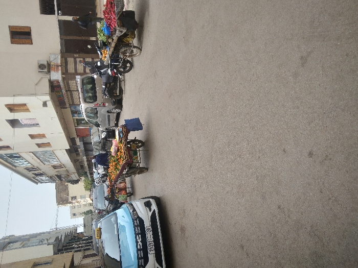 The image displays a street scene within the city of Meknes, Morocco. The paved asphalt road occupies the foreground and mid-ground. On the left, a light blue and white Dacia taxi, bearing a "TAXI" sign on its roof and a front license plate reading "25332 | 28," faces slightly towards the viewer. In the mid-ground, two wheeled handcarts laden with produce are visible; one predominantly displays oranges, and the other, attached to a black scooter-like motorcycle, holds a variety of vegetables including red root vegetables and green leafy items. A person in a blue hooded garment stands near the orange-laden cart. Further down the street, multiple vehicles are parked or in transit, including a silver minivan and several dark sedans. Multi-story buildings with light-colored facades and various window styles line both sides of the street; some feature ground-level commercial establishments. An air conditioning unit is affixed to the building on the right. Additional indistinct individuals are present further down the street. The sky above appears overcast.