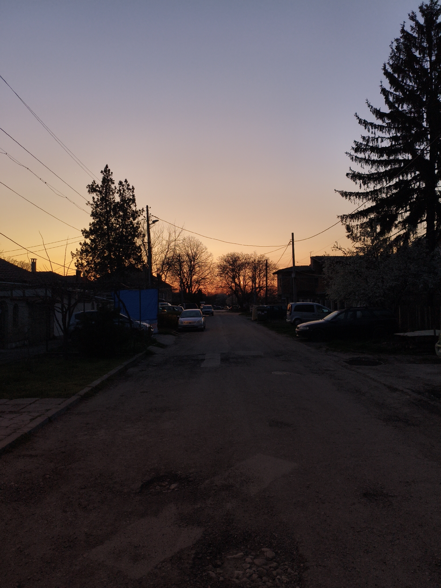 The image depicts a residential street in Dobrich, Bulgaria at sunset. The sky transitions from orange near the horizon to a pale blue above. The road is unpaved with visible potholes and leads towards the horizon. Several parked cars line both sides of the street. Silhouetted trees and buildings are visible against the colorful sky. Power lines run overhead. There are no visible people in the image.