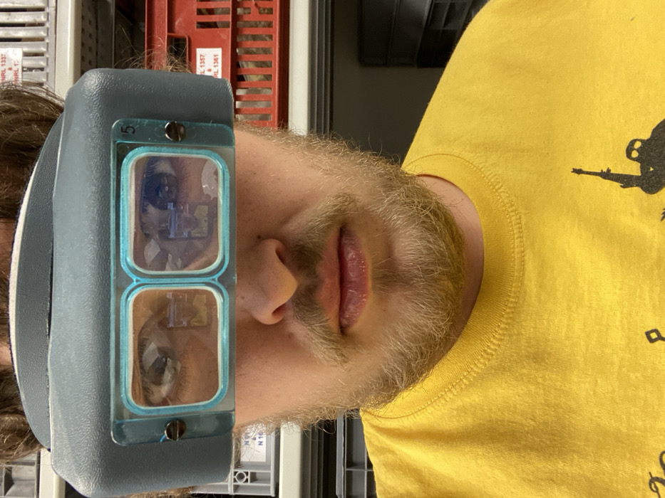 An adult Caucasian male is depicted in a close-up, head-and-shoulders portrait in Apt, France. He possesses light brown, medium-length hair, a full light-brown beard, and a mustache. His facial expression is neutral, with lips closed. He is wearing a bright yellow short-sleeved t-shirt, which displays a dark, partial silhouette graphic resembling a figure holding an elongated object on the lower right. Over his eyes, he wears a grey-blue head-mounted optical magnifier with two rectangular lenses framed in teal. The lenses reflect a small, rectangular, multi-component object, consistent with an electronic chip or specimen under observation. The numeral "5" is visible on the right side of the magnifier frame. The background consists of organized storage shelving units: light grey plastic containers are visible on the left, bearing partial labels such as "N NPL 16" and "N NPL 17"; red plastic containers are visible on the right, with partial labels including "NPL 1337", "NRL 1357", and "NRL 1361". The environment appears to be an indoor laboratory or storage facility.