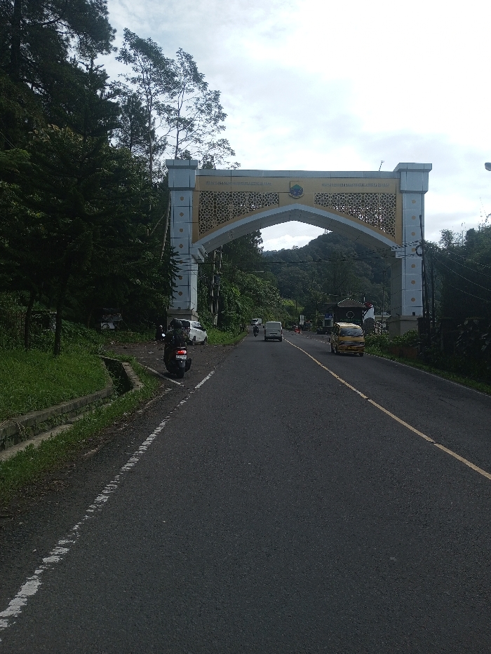 The image depicts an asphalt road leading towards a mountainous, vegetated area, passing under a decorative archway