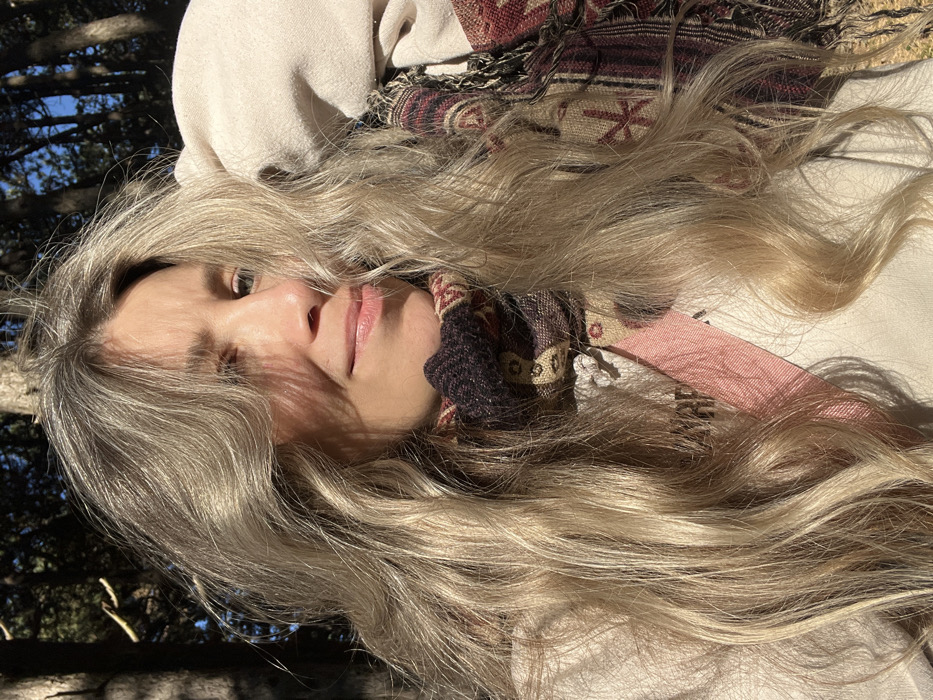 The image depicts a female individual outdoors in Škaljari, Montenegro. She is positioned against a natural background of trees under direct sunlight, casting shadows across her face. Her long, wavy, blonde hair extends over her shoulders and chest. She wears a light-colored long-sleeved top and a patterned scarf with dark brown, beige, and red-brown geometric designs around her neck. A pink strap crosses diagonally from her upper right to lower left. Her left eye is visible, and she exhibits a slight smile. To the right of the subject, a patterned fabric object with red, beige, and dark patterns and tassels is visible, appearing to be draped behind her. The environment consists of tree trunks and branches, with patches of blue sky visible, indicating a wooded or forested area.