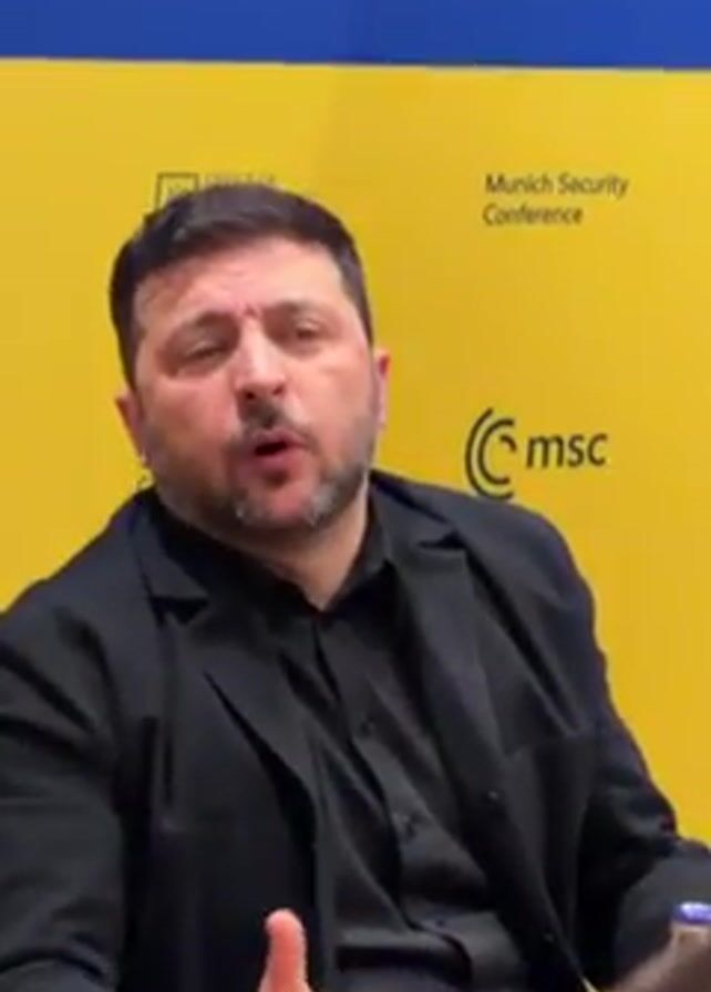 Volodymyr Zelenskyy, the President of Ukraine, is seated and speaking. He is wearing a black suit jacket and black button-down shirt. He has dark hair and a salt-and-pepper beard. Behind him is a yellow and blue backdrop with logos for the Munich Security Conference and the Office of the President of Ukraine.