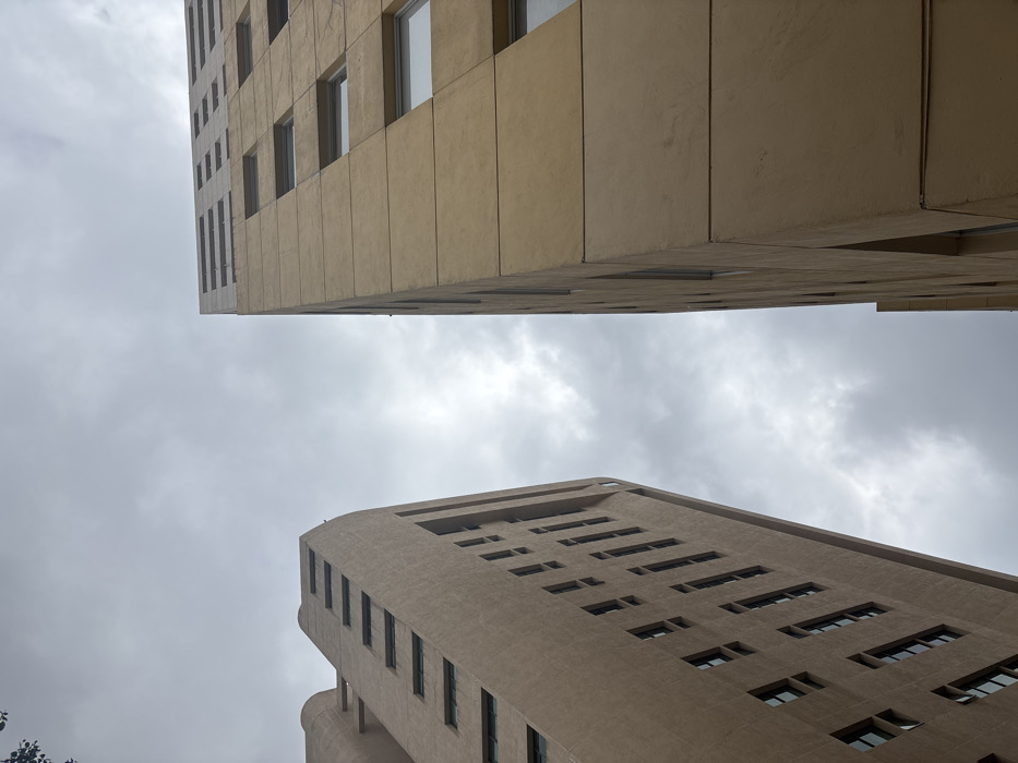 Two buildings are visible against a cloudy sky, with the viewpoint looking upwards. The upper building presents its underside, showing rectangular structural elements. Its exterior is textured and beige, with evenly spaced windows. The lower building angles upwards, displaying a similar beige facade and window pattern. The sky fills the space between the buildings, characterized by grey clouds.