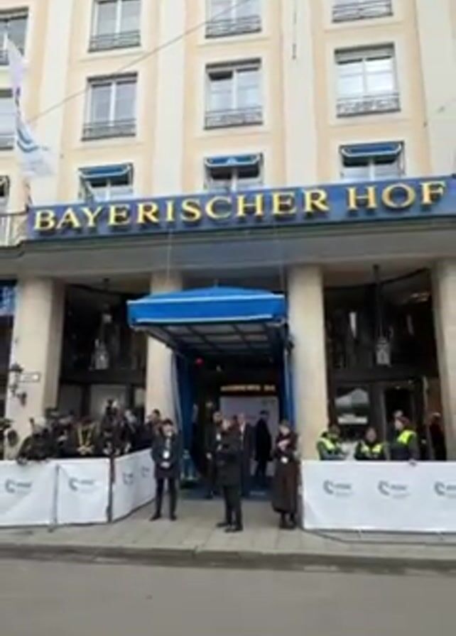 entrance to the Bayerischer Hof Hotel. There are people standing outside the entrance, including what appear to be journalists and security personnel. The hotel has a beige facade and blue awnings. The event is apparently sponsored by MSC. People are entering and exiting the hotel.