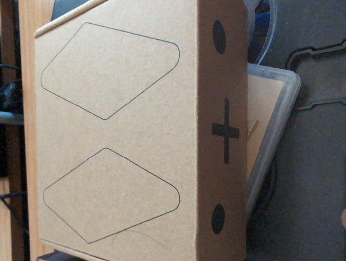 A brown cardboard box with two black diamond shapes printed on the top