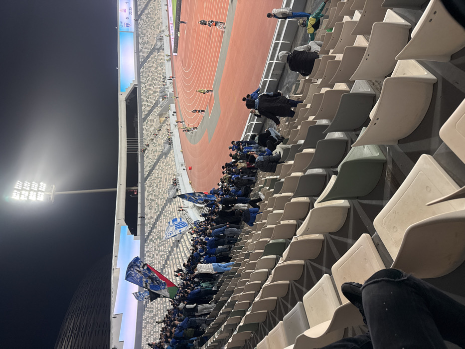 A stadium view from the stands. Rows of empty seats stretch into the distance. A track surrounds the field. People stand and cheer, waving blue and white flags. A bright floodlight illuminates the scene. The sky above is dark. Part of a person's legs and jeans are visible in the lower right corner, implying the perspective of someone sitting in the stands.