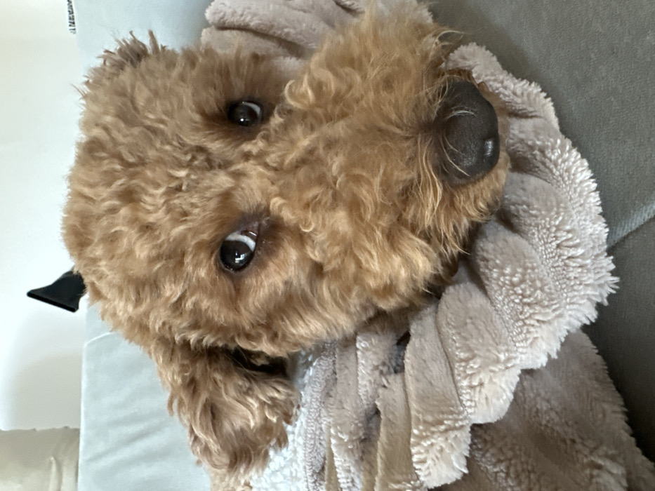 - "The image displays a close-up, eye-level photograph of a reddish-brown, curly-haired dog, consistent with a Poodle or Poodle mix, positioned indoors" by FM-Z1DMO2, licensed under CC BY 4.0
