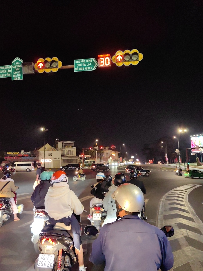 The image displays a nighttime scene at a busy urban intersection in Da Lat, Vietnam