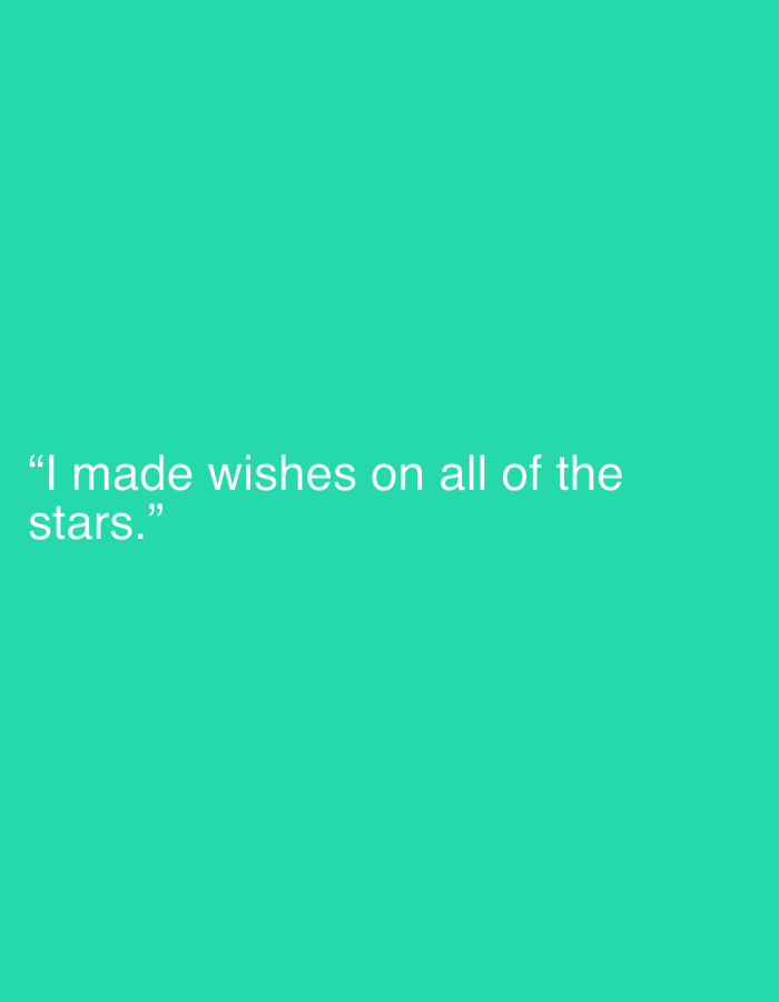 The image displays a solid teal-green background. White text, enclosed in quotation marks, is positioned on the left side, approximately centered vertically. The text reads: "I made wishes on all of the stars." No individuals, specific subjects beyond the text, actions, or interactions are present in the scene. The environment consists solely of the uniformly colored background. No geographical features or markers are discernible to identify any specific location, including the city of San Sebastián de Aparicio, Mexico.