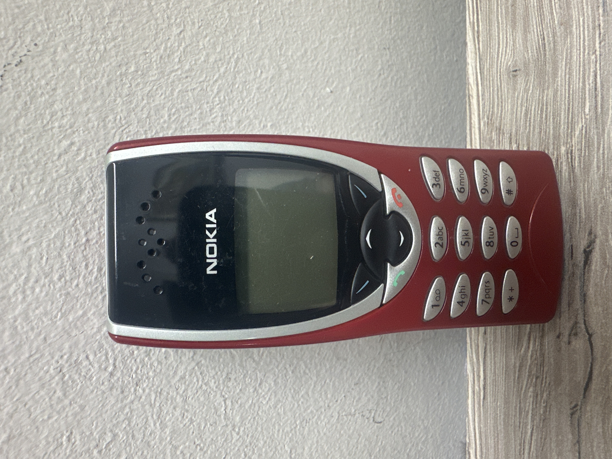 A red Nokia 3310 mobile phone is lying on a surface with a wall behind