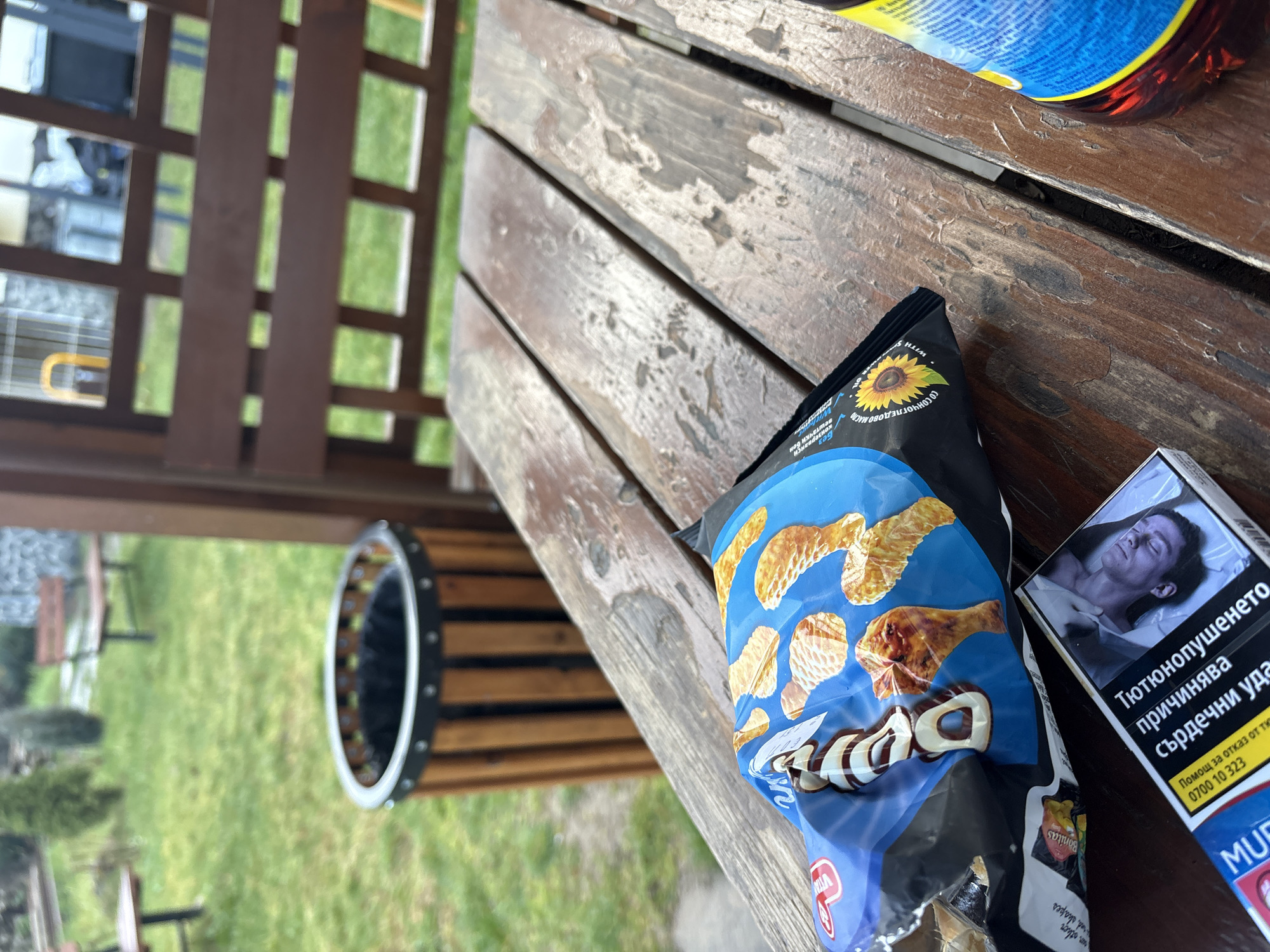 The image depicts a close-up, elevated view of a weathered wooden picnic table in an outdoor setting within Eleshnitsa, Bulgaria. On the table, a partially open bag of chips with blue, black, and white packaging, featuring images of potato chips, chicken drumsticks, and swirled snacks, is prominently displayed. Text on the chip bag, including a sunflower icon, is in Bulgarian, indicating "with sunflower oil." Adjacent to the chip bag, a cigarette pack, partially visible, is oriented vertically. Its blue, white, and black packaging displays a Bulgarian health warning: "Тютюнопушенето причинява сърдечни удари" (Smoking causes heart attacks), alongside a black and white graphic image of a supine man. A red-brown plastic bottle containing a dark liquid is partially visible on the far right of the table. In the blurred background, a slatted wooden trash bin with a black liner is positioned on a patch of green grass. Further back, additional wooden benches are visible across a grassy area dotted with evergreen shrubbery. A wooden structural element, possibly part of a pergola or shelter, frames the right side of the image. The overall environment suggests a public park or garden area.