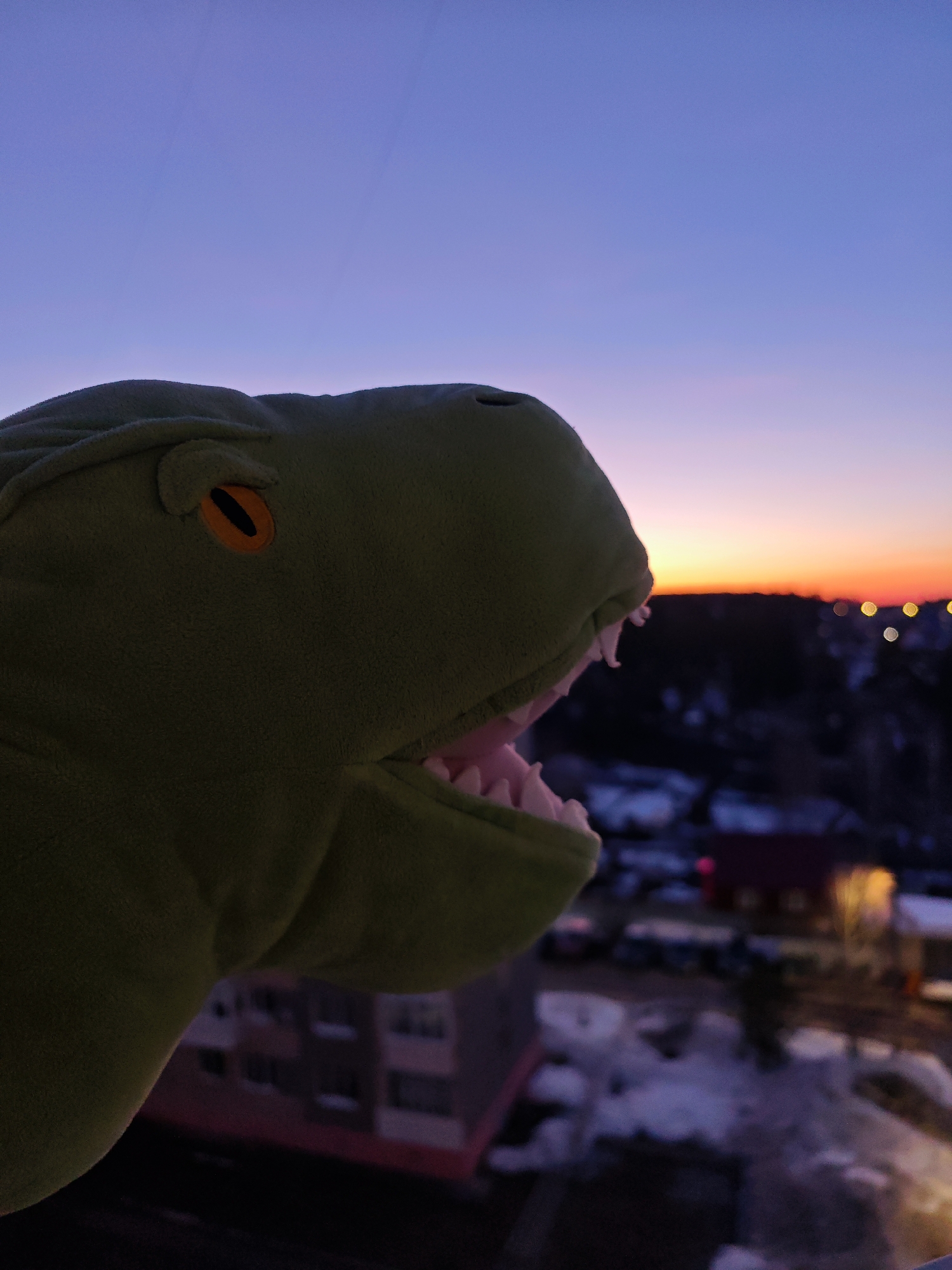 A close-up image features the head of a plush, green dinosaur toy in the foreground, with a city scene visible in the background under a sunset sky. The dinosaur toy's head is positioned on the left side of the frame, with its open mouth and pink interior visible. Its eye is a prominent orange circle. The background showcases an urban environment. Buildings are visible, some with multiple windows. Patches of snow are present on the ground, mixed with roads and parking areas with parked cars. Streetlights cast a warm glow on the scene. The sky transitions from a deep blue to orange and pink near the horizon, suggesting either sunrise or sunset. Based on visual characteristics and known datasets, the city in the background could be the city of Chaikovsky in Russia.