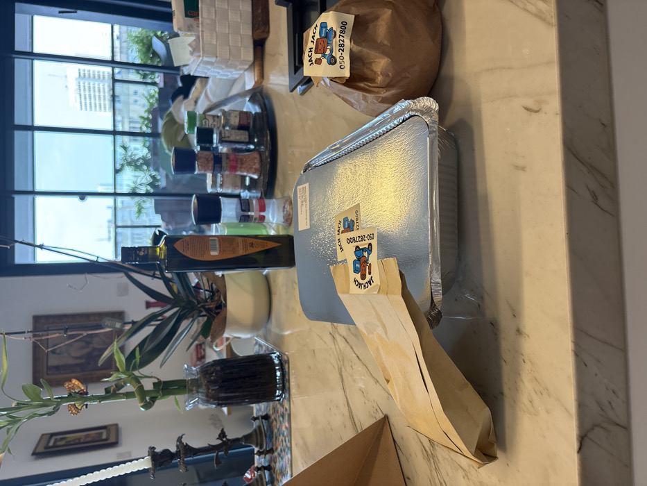 The image displays a white marble countertop within a residential interior, likely a kitchen or dining area, in Tel Aviv, Israel. In the foreground, two delivered food items are present: a rectangular aluminum foil container with a lid, and a smaller, irregularly shaped item wrapped in brown paper, both prominently featuring "Jach Jach" brand stickers with a delivery scooter/truck logo and the Israeli phone number 050-2827800. A plain brown paper bag is partially visible on the far left of the countertop. Behind the delivered food, various household objects are arranged: a dark green bottle of olive oil with an orange label, a collection of spice grinders and jars positioned on a dark circular tray, an ornate dark metal candlestick holding a white candle, a clear glass vase containing green bamboo shoots and adorned with a small orange butterfly clip, and a potted plant in a white pot. A white woven basket is visible in the upper right background. The background features a large window with dark frames, offering a view of an urban landscape. Distant high-rise buildings and other city structures are visible, consistent with a densely populated city environment, further confirming the location in Tel Aviv, Israel. No people are visible in the scene, and no direct actions are depicted.