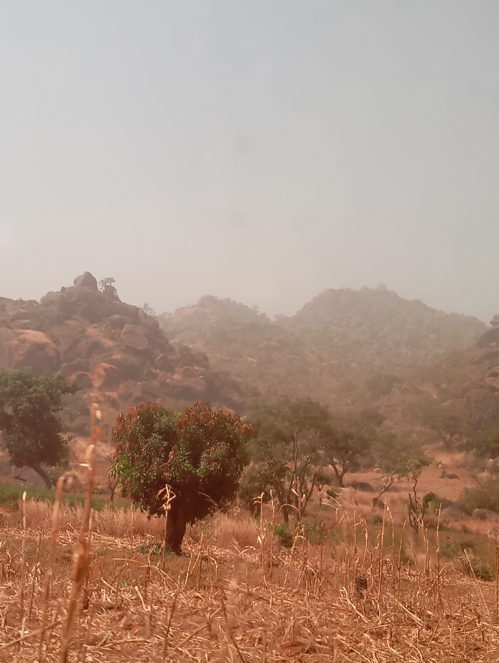 A landscape depicts dry, golden-brown vegetation in the foreground. Trees, some with green leaves, dot the midground. Rocky, hill-like formations ascend in the background, partially obscured by a hazy, light-colored atmosphere. The sky is a uniform, pale color, contributing to the scene's overall muted and arid appearance. Tall, dried stalks occupy the immediate foreground.