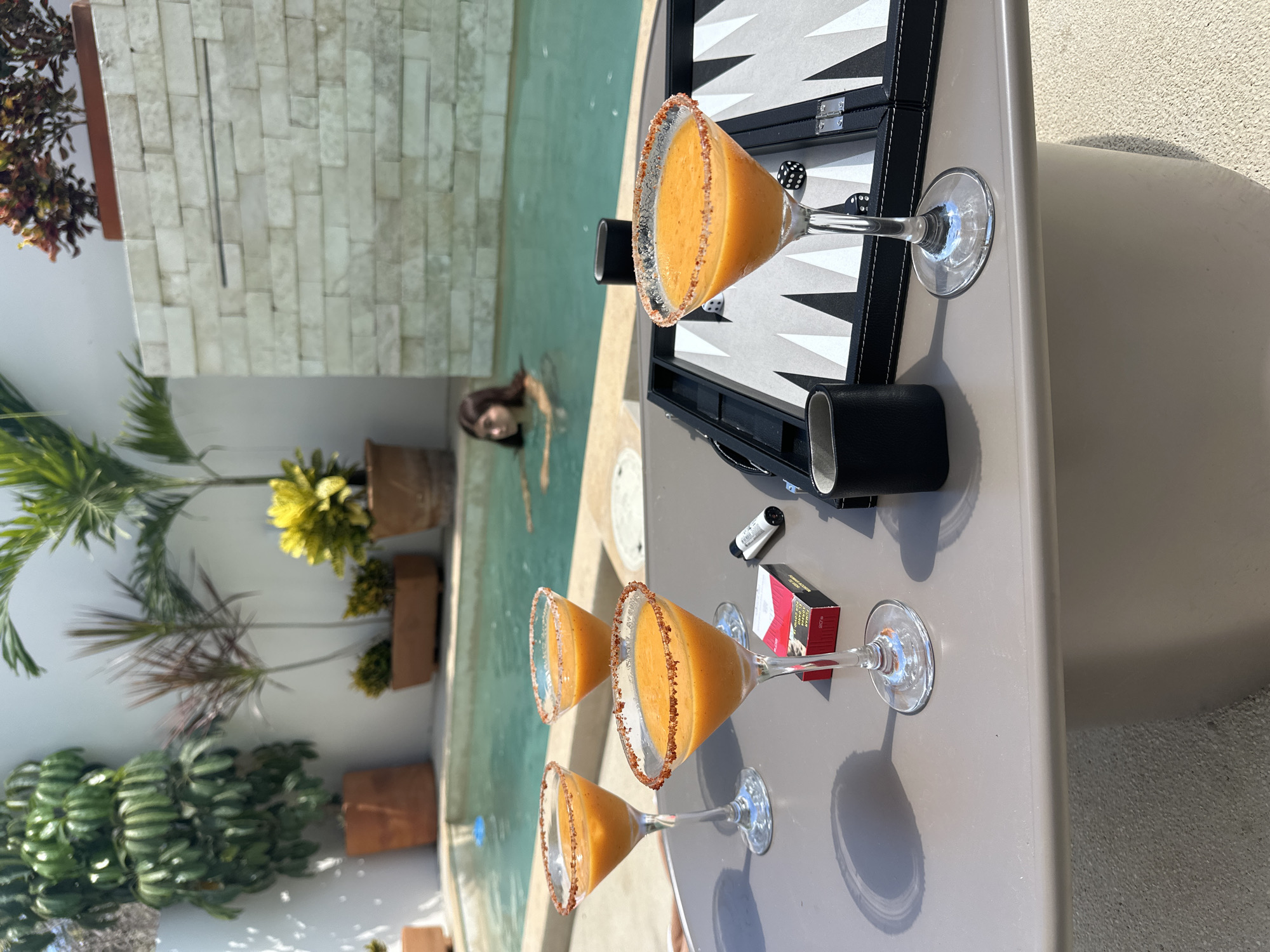 table set beside a swimming pool, situated in what appears to be a private outdoor area. The table holds three cocktails in martini glasses, each rimmed with a reddish-brown substance, suggestive of spice or sugar. Next to the cocktails is a backgammon set, with dice visible on the board, and a pack of cigarettes along with a lighter. A woman is visible in the swimming pool. The background features tropical foliage and potted plants, as well as a wall constructed of rectangular white blocks, suggesting a modern architectural style. The presence of such items and the swimming pool is typical in hotels or private accommodations in Brisas de Zicatela, Mexico.