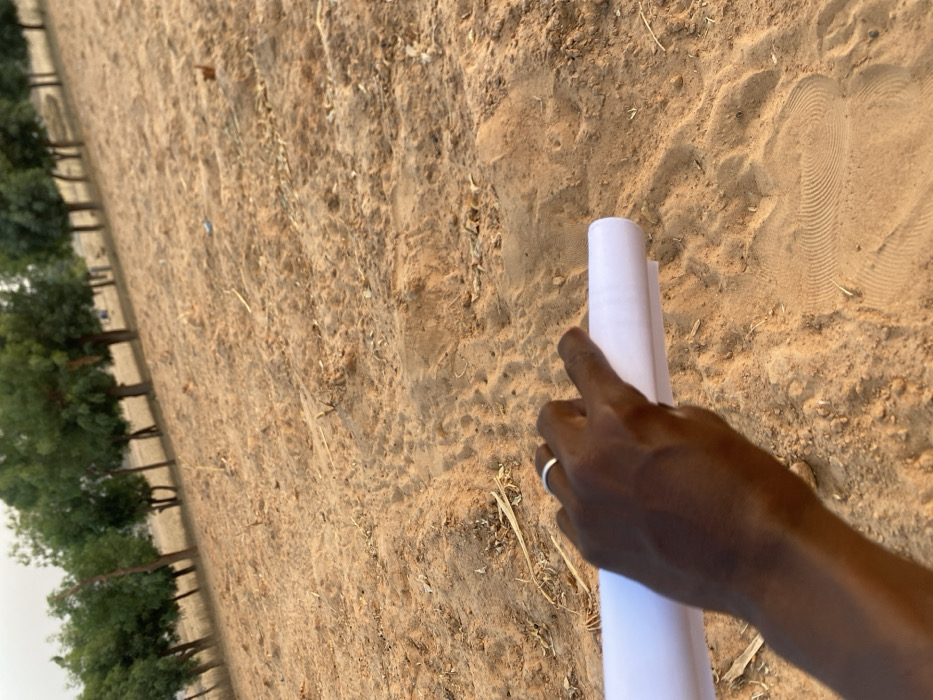 A tilted view of a sandy landscape is shown. A row of green trees is visible to the left. In the foreground, a dark-skinned hand is holding a rolled white paper. The hand has a ring on one finger. The ground is a mix of light brown and beige tones, with textures indicating dry earth and footprints. The lighting suggests a sunny day.
