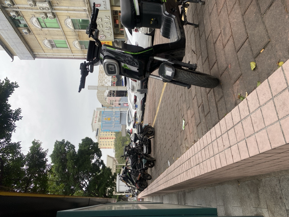 A row of parked motorcycles and cars lines a brick walkway next to a low wall. A black and green electric motorcycle dominates the foreground. Buildings rise in the background, including one with a domed structure. Trees are visible on the left. The sky is overcast. The scene appears to be a street or parking area in an urban setting.