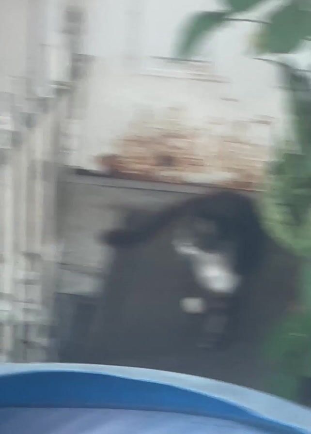 - "A single unedited shot shows a grey and white patterned cat standing on a set of wooden stairs outside" by FM-Bmkwx1, licensed under CC BY 4.0