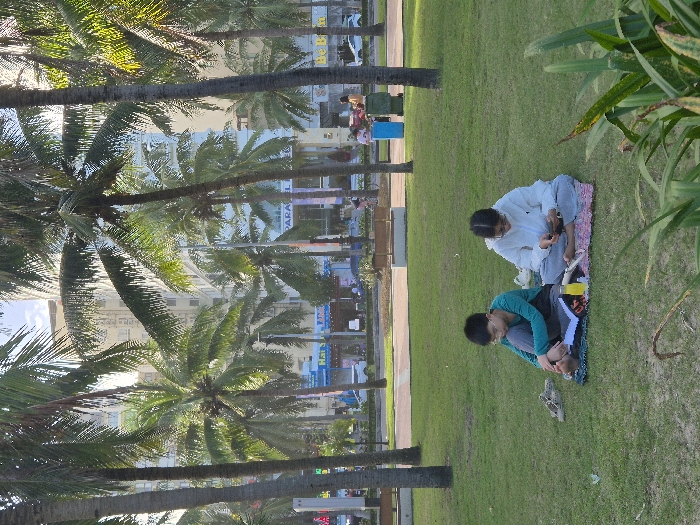 Two individuals are seated barefoot on a patterned mat on a manicured grassy expanse within a park in An Hải Ward, Vietnam