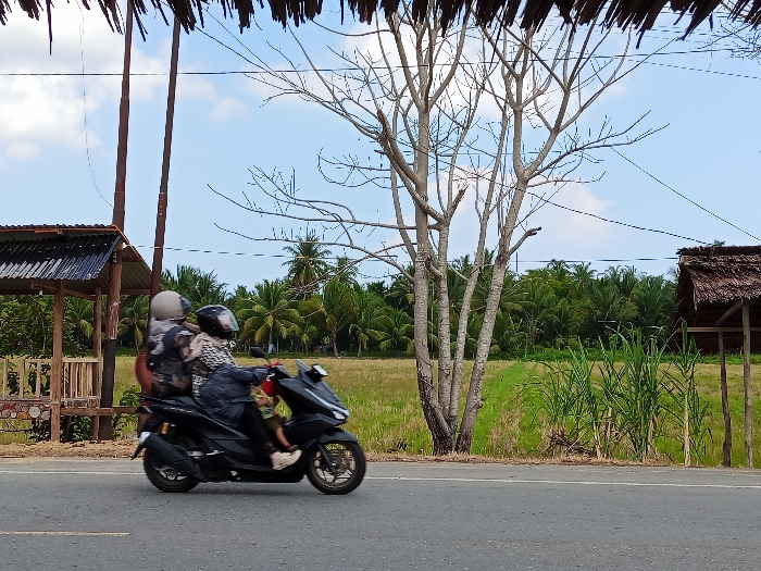 An outdoor scene in Keudealuerheung, Indonesia, displays a black scooter-type motorcycle in motion on an asphalt road under a partially cloudy blue sky. Three individuals are aboard the motorcycle, traveling from left to right. The driver, an adult, wears a black full-face helmet and a patterned long-sleeved garment. A small child, wearing a red top, is seated in front of the driver. The rear passenger, an adult, wears a light-colored helmet and a camouflage-patterned backpack. To the left of the road, a rustic wooden shelter with a dark corrugated metal roof is visible, supported by wooden poles, with two utility poles standing behind it. Centered in the midground, a prominent deciduous tree with bare branches stands between the road and expansive green agricultural fields, which stretch into the background where a dense line of palm trees is visible. To the right of the scene, another smaller, open-sided structure with a thatched roof is present, with tall green stalks of vegetation bordering the roadside in front of it.