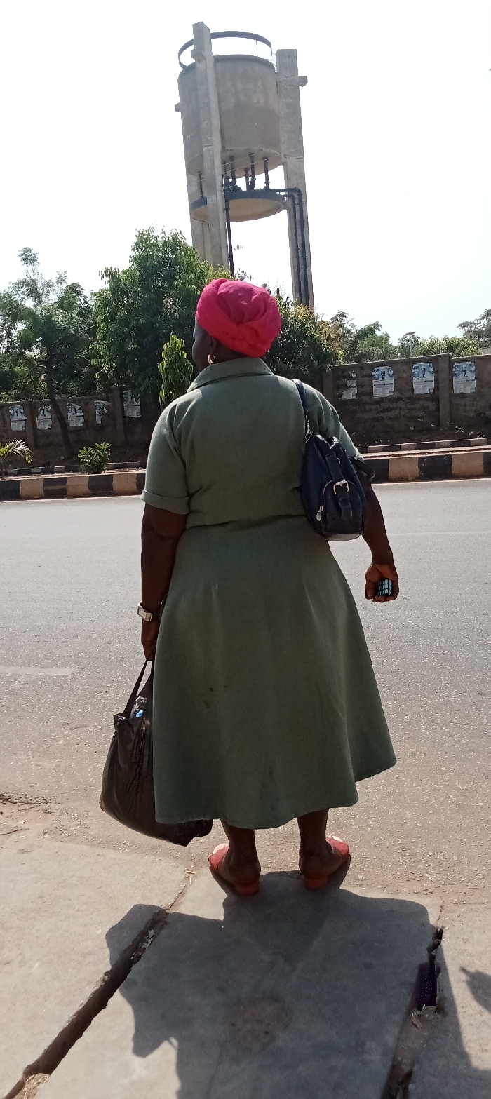- "The image displays an individual, viewed from behind, standing on a light grey concrete sidewalk in Kabala, Nigeria, under bright daylight" by FM-gYzzh1, licensed under CC BY 4.0