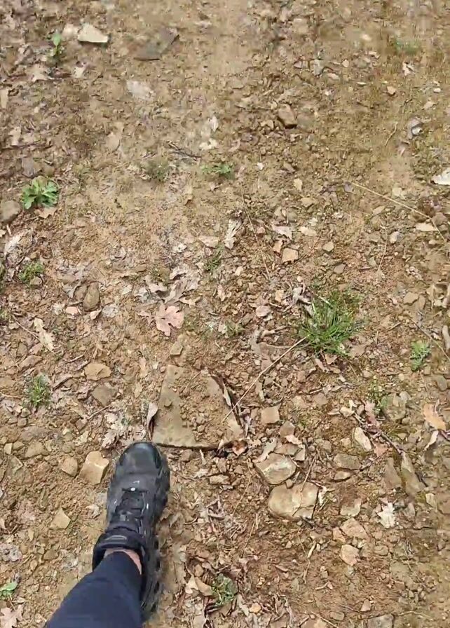 A person is walking on a dirt path covered in leaves and small rocks through a forest
