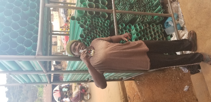 An adult male stands outdoors in Ado-Ekiti, Nigeria, partially obscured by a multi-tiered dark metal rack displaying numerous green pipes of varying diameters