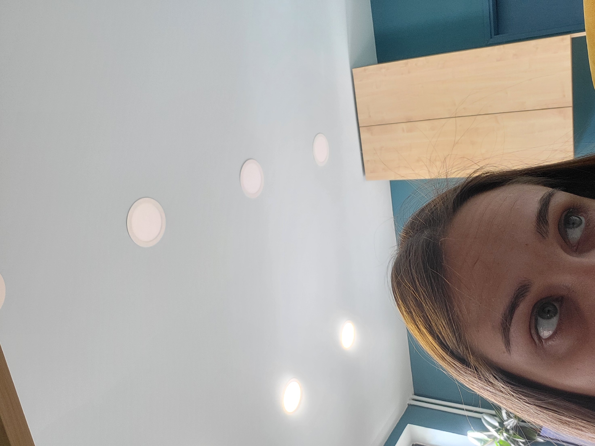 The image depicts an indoor scene located in Kragujevac, Serbia. The upper two-thirds of the frame are occupied by a light-colored ceiling (white or pale gray), featuring five circular recessed light fixtures. Three of these fixtures are actively illuminated, while two are unlit. The lower third of the image reveals portions of the room's environment and an individual. The walls are a uniform teal or dark blue color. On the left side, a partial view of a white-framed window or opening is visible, along with a white pipe (likely a radiator pipe) and a green houseplant with broad leaves. On the right, two light-colored wooden cabinet doors are present, beneath the ceiling line, adjacent to a dark teal-colored doorway. The bottom of the frame is dominated by the upper portion of an individual's head, including their forehead, eyebrows, and eyes. The individual has light brown hair. Both eyes are open, with the pupils directed upwards and slightly to the right, indicating an upward gaze towards the ceiling. No other people, subjects, or direct interactions are visible.