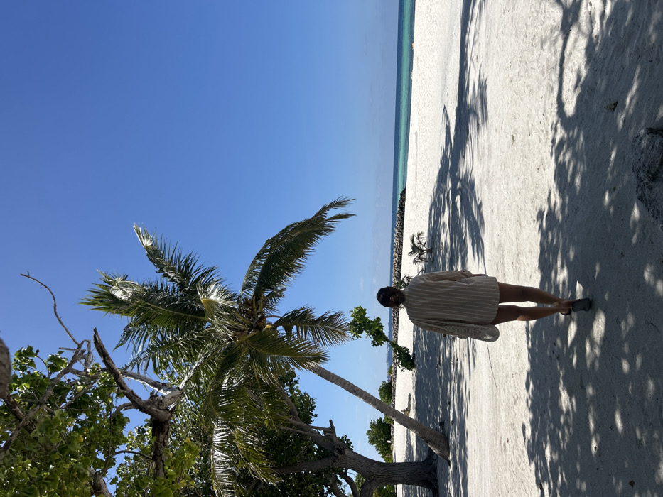 The image depicts a single individual walking away from the camera on a white sand beach in Maafushi, Maldives. The person, a female with dark hair tied back, wears a light beige long-sleeved shirt with vertical stripes, dark shorts, and dark sandals, carrying a light-colored net bag on her left shoulder. She proceeds towards the clear turquoise and blue ocean, which occupies the right half of the mid-ground and background. On the left side, a large palm tree with green fronds leans diagonally across the upper and middle sections of the frame, alongside other trees with green foliage. These trees cast prominent, dark shadows across the sun-drenched white sand in the foreground and mid-ground. A rock barrier or breakwater runs horizontally along the shoreline, separating the beach from the ocean in the mid-distance. Smaller palm saplings are visible closer to the water. The sky is clear and bright blue, filling the upper right portion of the image. Faint, indistinct structures are visible on the distant horizon line.