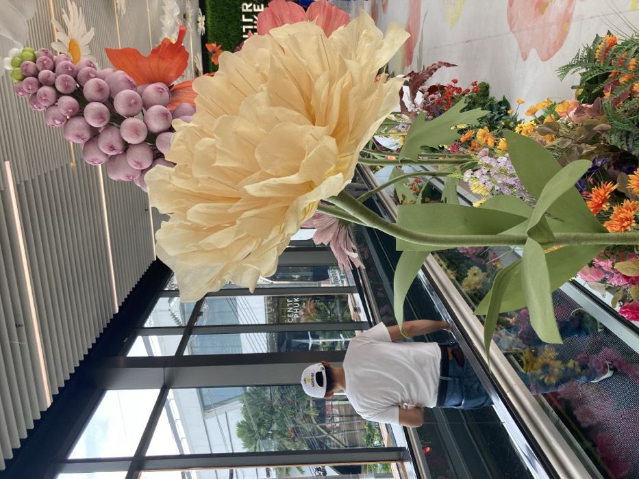 The image depicts an indoor area of Central Phuket in Wichit, Thailand. An adult male, viewed from the back, stands on an escalator moving alongside a multi-paneled glass window wall. He is dressed in a white short-sleeved t-shirt, blue jeans, and a white baseball cap, with a dark object visible in his right back pocket. Dominating the right foreground is a large, light-yellow artificial flower constructed from paper-like material, featuring a prominent green stem and large green leaves. Above and behind this, a large cluster of smooth, light-purple, spherical decorative elements is present, along with a portion of a red-orange artificial butterfly and a pink artificial flower. A continuous ground-level display of various artificial flowers and foliage in hues of yellow, orange, pink, purple, and green extends parallel to the escalator. The floor features subtle, light-colored painted floral patterns. Through the expansive window, exterior modern buildings, lush green trees, and an overcast sky are visible, with the text "CENTRAL PHUK" clearly legible on a distant structure. The ceiling is characterized by light-colored horizontal slats and integrated linear lighting fixtures.