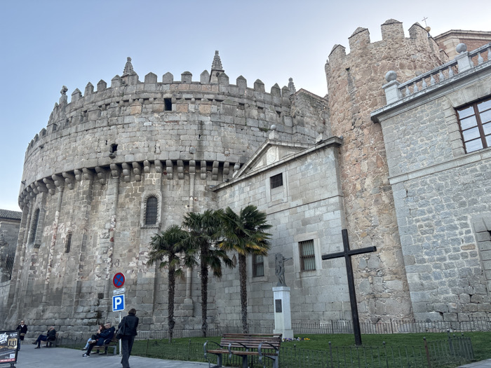 The image displays the fortified apse of the ÁVila Cathedral in ÁVila, Spain, integrated into the city walls, under a clear light blue sky. The prominent central and left portion of the scene is dominated by a massive, circular stone structure, the cathedral's apse, constructed from large, rough-hewn stone blocks. It features a crenelated parapet adorned with small, pointed spires and battlements, along with several narrow, arched windows. To the right of the apse, adjacent stone buildings with varying textures of masonry are visible, including one section with a stone balustrade and windows, and another rougher stone tower-like structure extending upwards. Three tall, slender palm trees are positioned in front of the cathedral apse. Directly to their right, within a grassy area enclosed by a low metal fence, stands a light-colored stone statue of a figure on a pedestal. Further right, a large, dark wooden cross is planted upright in the grass. In the foreground, a paved pedestrian area features several wooden benches. On the leftmost bench, three individuals are seated, and another person stands nearby. On a second bench to the right, two individuals are seated. A lone person in dark clothing walks away from the camera in the central foreground. A blue parking sign ('P') and a red circular 'no stopping' or 'no parking' sign are mounted on a pole near the palm trees. The overall environment suggests a public square or park area adjacent to the historic cathedral.