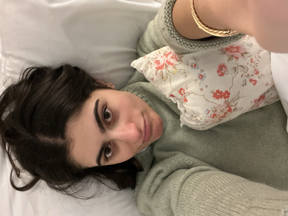 A woman lies in bed, resting her head on a floral-patterned pillow. She wears a pale green sweater and a gold bracelet is visible on her wrist. The woman's dark hair is slightly disheveled on the white pillow, and she looks directly at the camera with a slight smile.