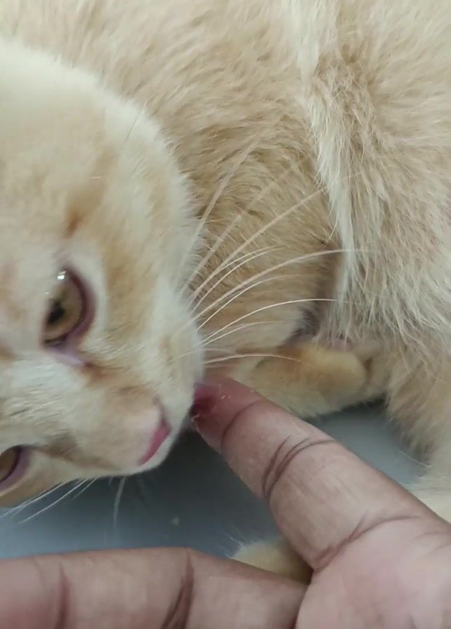 light orange cat licking a person's index finger. The cat has light brown eyes and a pink tongue. The person's finger has a small mark on it, possibly a dried stain. The cat is lying down on a light-colored surface.