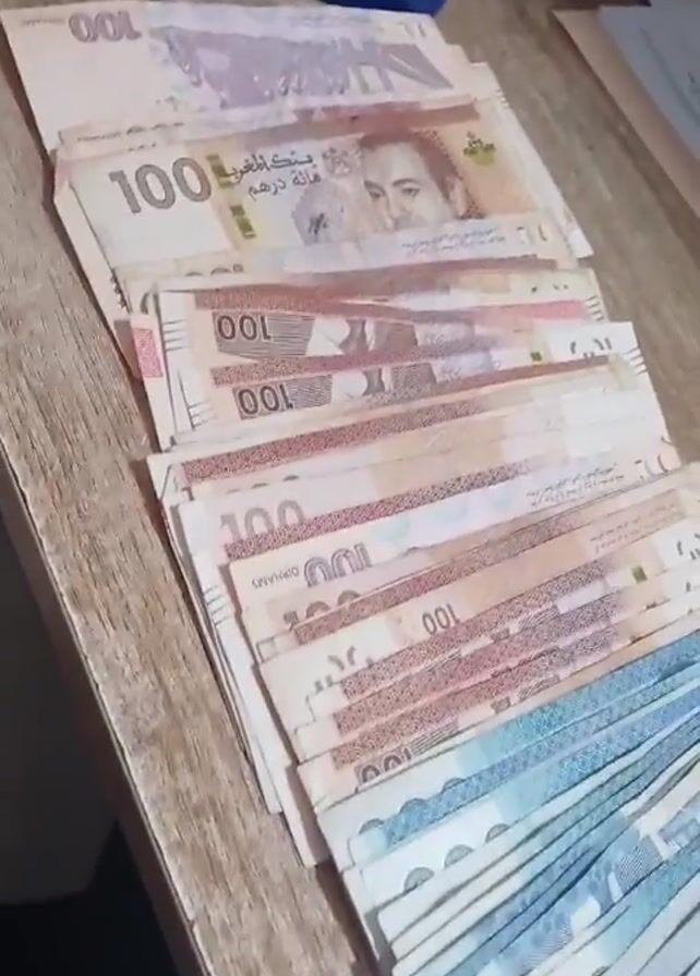 A close-up shot displays a stack of Moroccan currency arranged on a light wood-grain surface