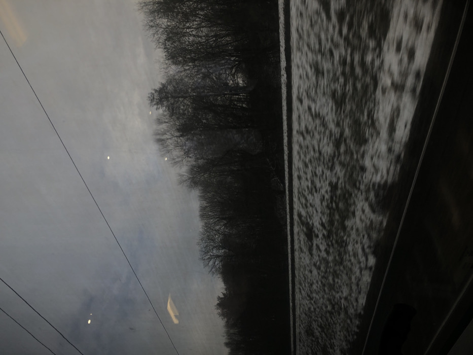 The image depicts a winter landscape as seen through a window, likely from a moving vehicle, in Dettwiller, France. The sky is overcast and grey with varying cloud density, occupying the upper half of the frame. Below the sky, a dense, dark line of leafless deciduous trees forms the horizon, appearing as silhouettes against the lighter sky. In the midground, a field or embankment slopes downwards from the tree line, covered with patchy snow and dark ground, exhibiting horizontal motion blur consistent with forward movement. The immediate foreground shows reflections on the window glass: two prominent circular bright lights are visible in the upper-mid section, and an elongated rectangular bright light is present in the upper-left quadrant. The bottom edge of the image is dark and indistinct, possibly indicating the vehicle's interior or window frame. No individuals, animals, or explicit actions are present in the external scene.