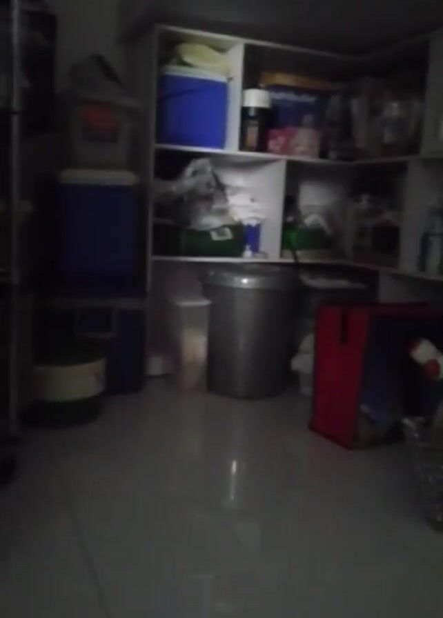 dimly lit room with tiled floors and shelves. The shelves are filled with various items, including blue and green containers, boxes, and bottles. There is also a metal trash can, a red bag, and a wicker basket filled with dark-colored items on the floor. The camera slowly pans across the room, providing a view of the stored items.