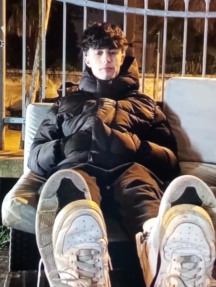 This image depicts a young male subject seated outdoors at night in Riga, Latvia. The individual, exhibiting short, dark, curly hair and a light complexion, looks directly at the camera with a neutral facial expression. He is wearing a black, hooded puffer jacket, dark trousers, and worn light-colored sneakers with laces. The subject is positioned on what appears to be an outdoor bench or couch equipped with light-toned cushions. In the background, a dark metal fence or railing featuring decorative curved elements is visible. Behind the railing, dimly lit dark outlines of vegetation, consistent with trees or large bushes, are present. The immediate scene is illuminated by an artificial light source.