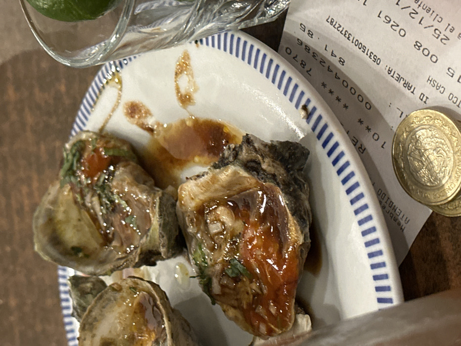 A plate of raw oysters, drizzled with sauce, sits near a glass with a lime wedge. A receipt is visible in the background with partially legible numbers and text. Gold-colored coins are stacked near the receipt. The receipt contains information like "ID TARJETA: 053150013372787", "TCO CASH 15 008 0261", and "25/12/1 el cliente". The receipt is slightly obscured by the plate and coins.