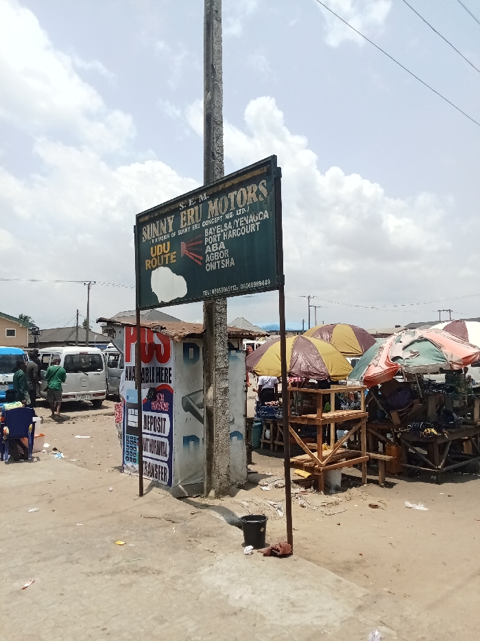 street scene in Ovwian, Nigeria. A large green sign advertising "Sunny Eru Motors" is prominently displayed on a metal pole, listing destinations including Bayelsa, Yenagoa, Port Harcourt, Aba, Agbor, and Onitsha. The sign also includes the words "Udu Route" and phone numbers. The scene is dusty and sandy, with a few cars parked nearby. Several people are present, including a few standing near the parked cars and others seated at tables under umbrellas. To the right of the sign is a small, partially visible structure with a sign that says "Available Here." This structure is decorated with advertisements for bank services including "deposit," "withdrawal," and "transfer."