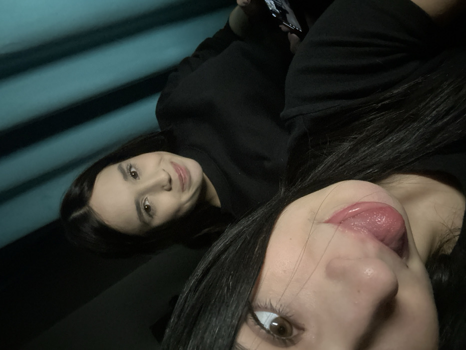 Two women pose closely, one smirking with a phone in hand, the other sticking her tongue out. Both have dark hair and appear to be wearing black sweatshirts. The picture is taken at an angle, with some blurry stripes visible in the background. The first woman has a subtle smile, while the second's expression is playful and exaggerated.