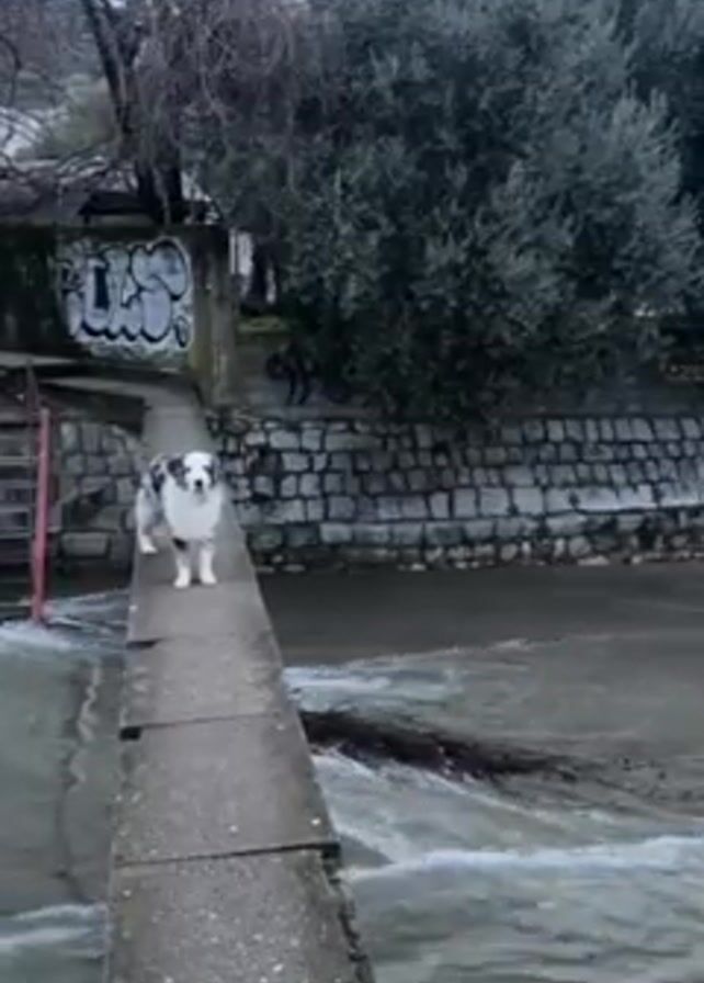 A medium shot shows a blue merle Australian Shepherd dog standing on a narrow concrete bridge spanning a rapidly flowing river