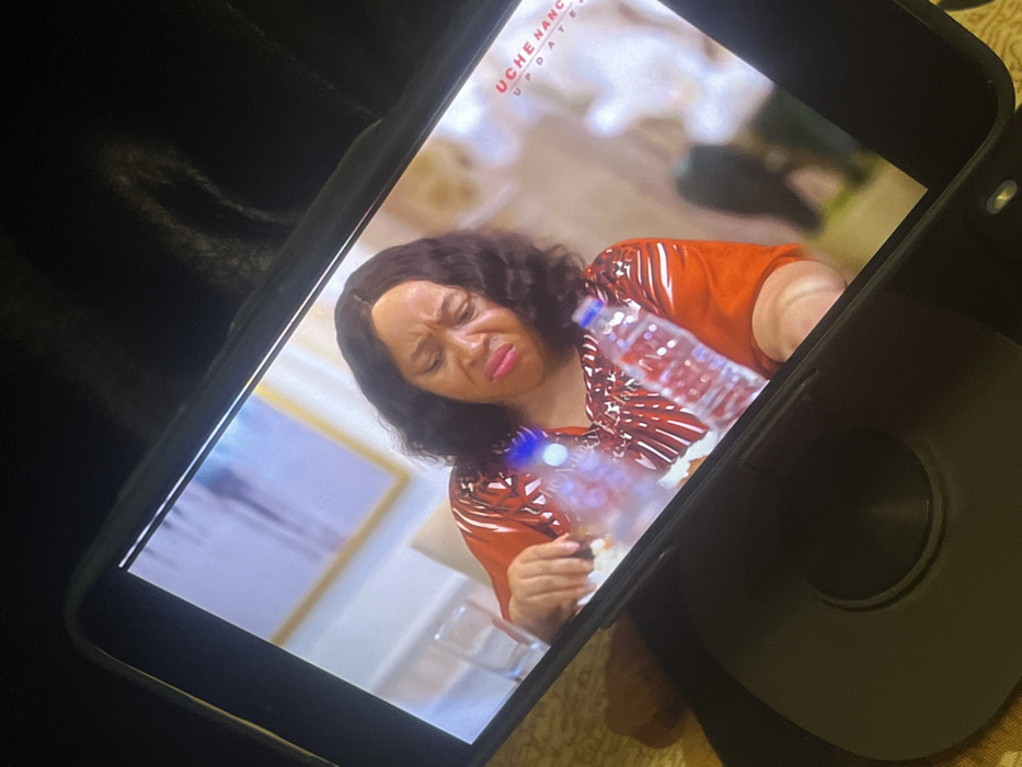 phone screen displaying a woman with an expressive face, holding a water bottle. She is wearing an orange and red patterned top. The text "UCHE NANC UPDATE" is visible at the top of the screen. The phone is in a dark case and is being held or propped up, with a dark background behind it. The angle is slightly tilted.